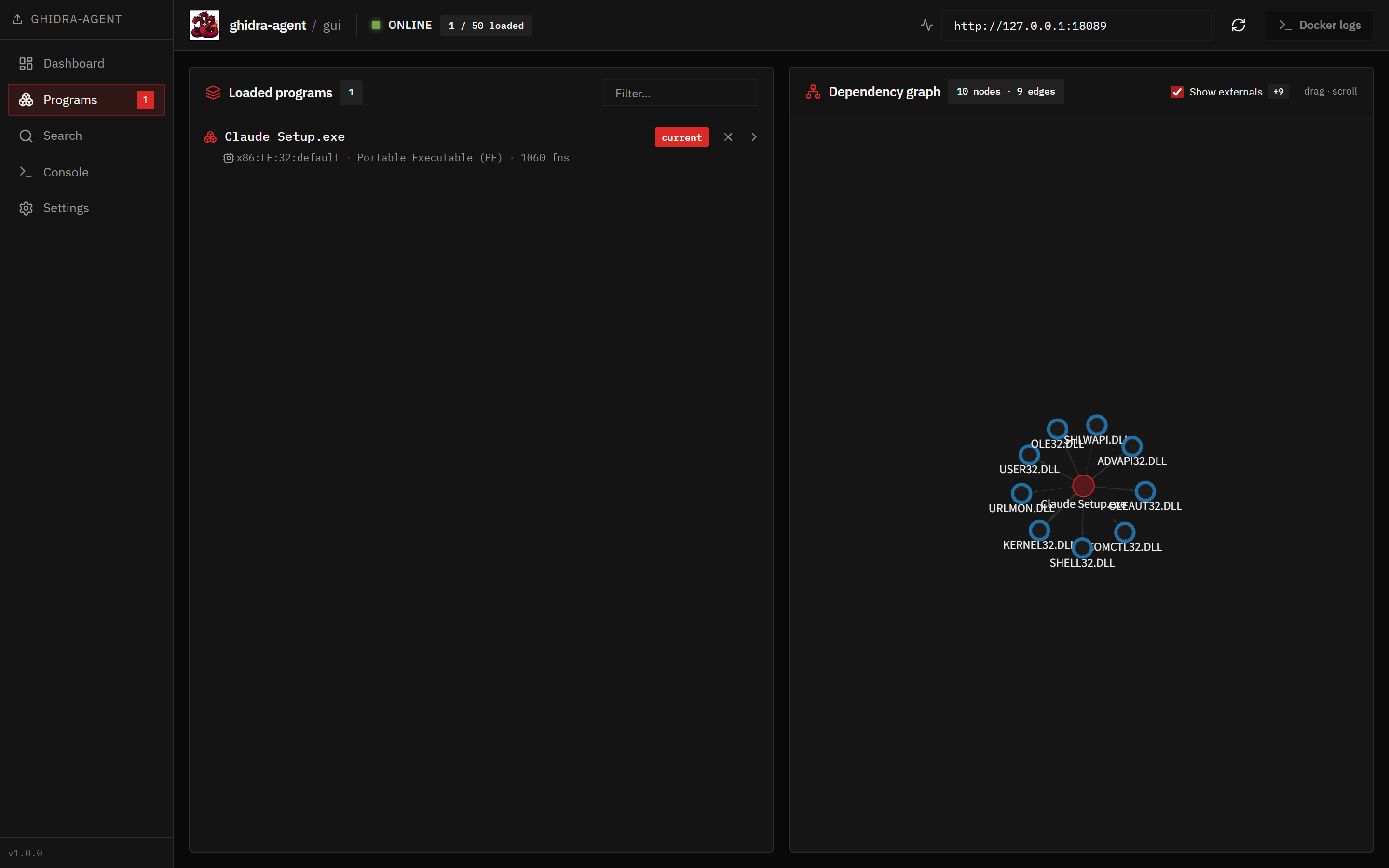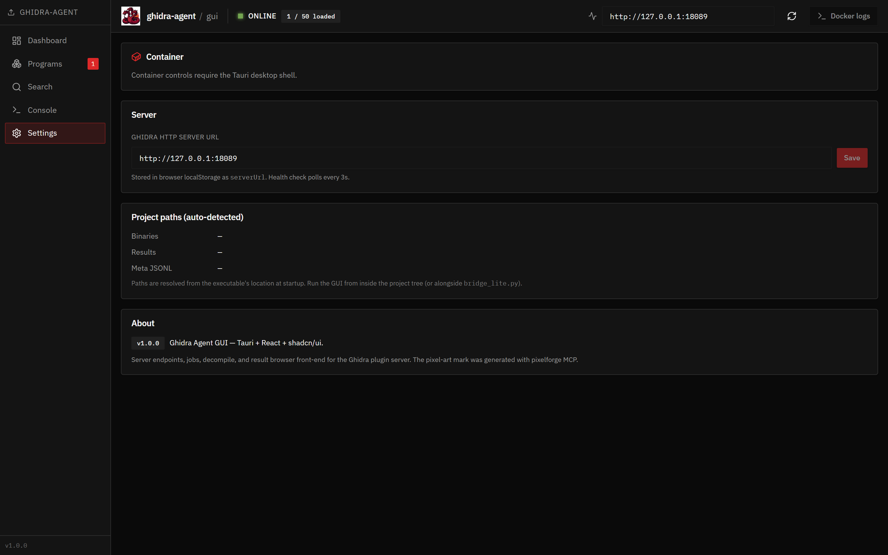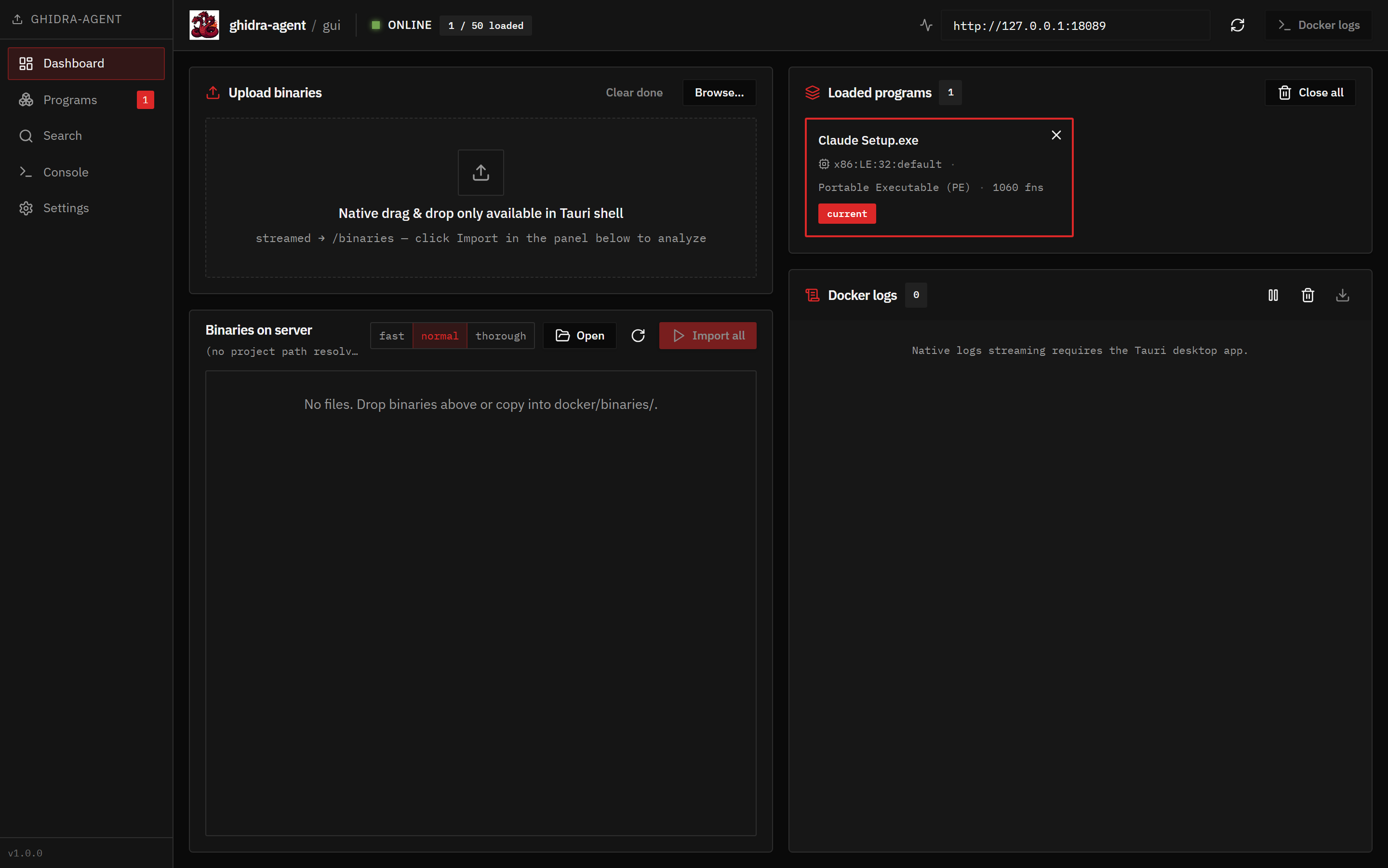 - v1.0.0에서 데스크톱 GUI를 추가했다. 같은 HTTP 서버를 GUI와 MCP 브리지가 공유하므로 GUI에서 import한 바이너리를 LLM이 그대로 조회할 수 있고, 결과 파일도 같은 트리에 누적된다.