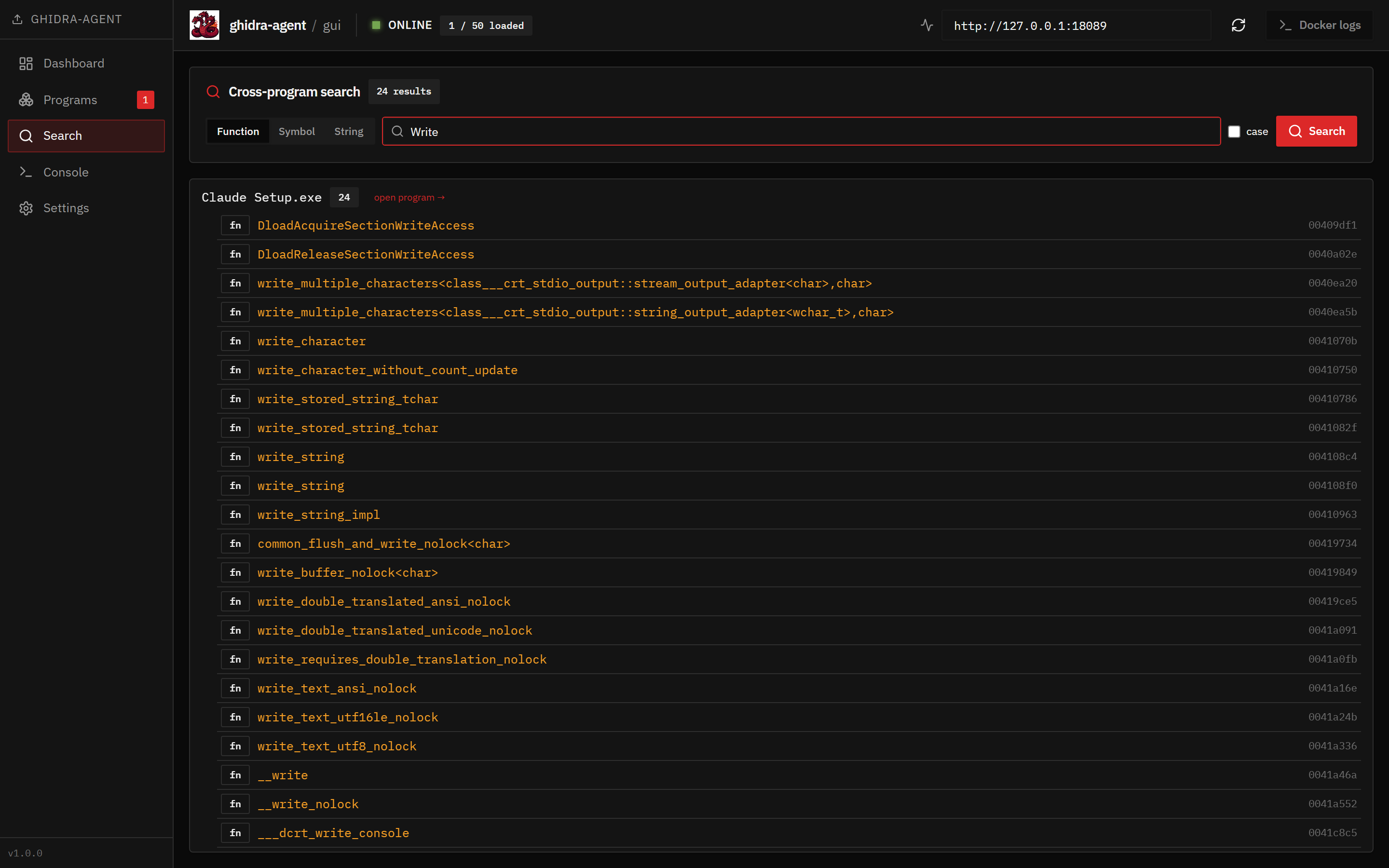 /search/functions,/search/symbols,/search/strings). - 결과 클릭 시 owning program의 디테일 탭으로 deep-link.