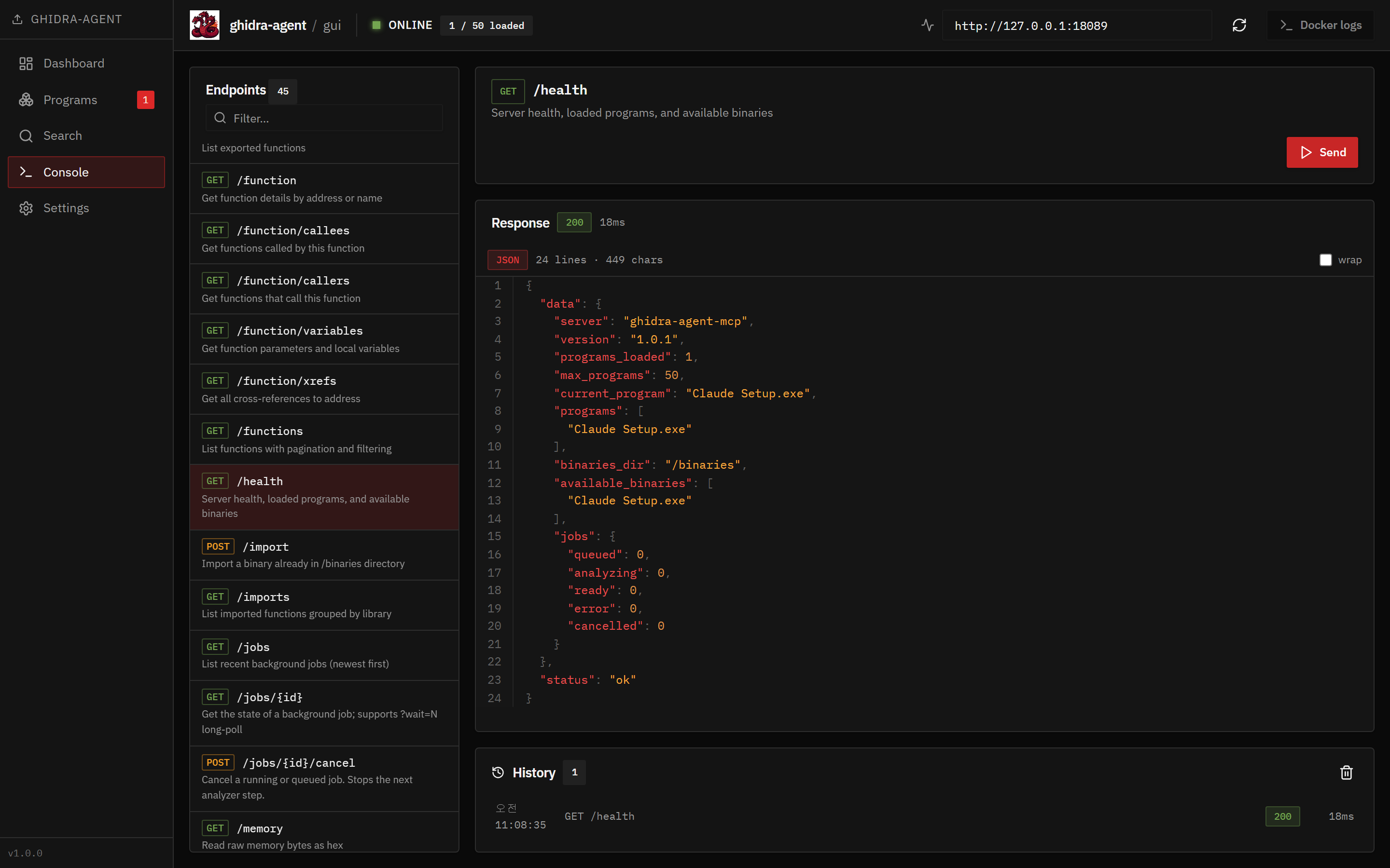 - v1.0.0에서 데스크톱 GUI를 추가했다. 같은 HTTP 서버를 GUI와 MCP 브리지가 공유하므로 GUI에서 import한 바이너리를 LLM이 그대로 조회할 수 있고, 결과 파일도 같은 트리에 누적된다.